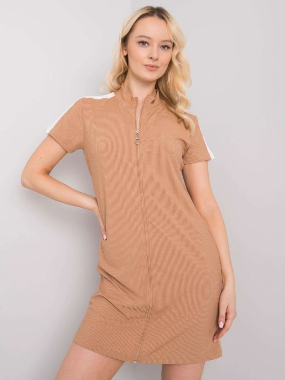 RUE PARIS Camelowa sukienka z krótkim rękawem.
