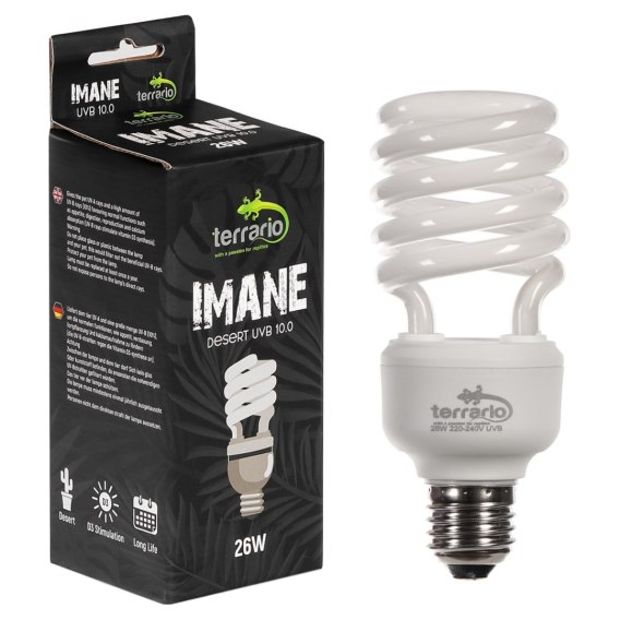 Terrario Imane Desert to żarówka spiralna stworzona dla gadów pochodzących z rejonów pustynnych i półpustynnych. Zapewnia zwierzęciu promienie UV-A i dużą ilość promieni UV-B (10%), przez co sprzyja funkcjom takim, jak apetyt, trawienie czy reprodukcja.